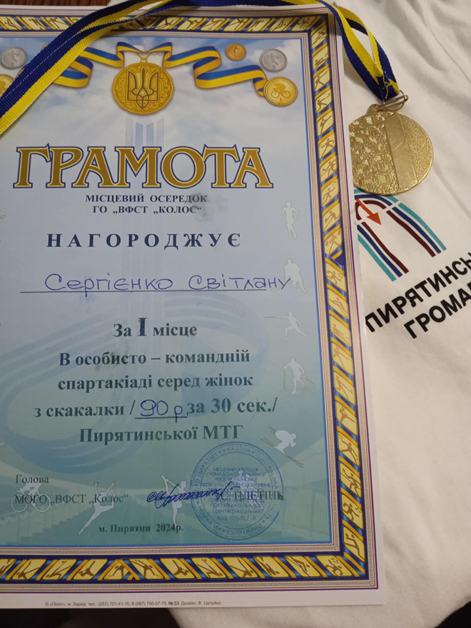 7-го березня, відбулася особисто-командна спартакіада Пирятинської громади серед жінок. Пирятинський ЗДО «Берізка» представила вихователь молодшої групи Сергієнко Світлана Петрівна, яка виступила у складі команди Пирятинської міської ради та виборола І місце у номінації стрибки зі скакалкою.